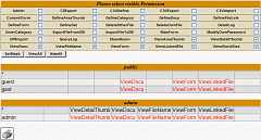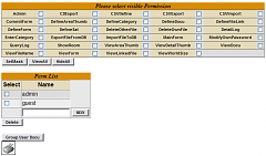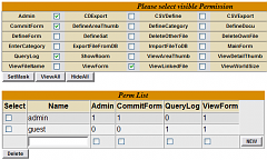 Hier werden Berechtigungsgruppen definiert. Das sind Berechtigungen für spezielle Funktionen der DesignBase. Eine solche Gruppe von Funktions-Berechtigungen (Permissions) bekommt dann einen eindeutigen - am besten gut beschreibenden - Namen. Dieser wird später bei der Benutzer- oder Gruppen-Erstellung benutzt und gibt einem bestimmten Benutzer oder Gruppe die definierten Funktions-Rechte. FunktionsweiseIn der Standard-Installation sind zwei Berechtigungsgruppen definiert: admin und guest. Die admin-Berechtigung hat fast alle wichtigen Funktionen aktiviert, die guest nur einige für das Anschauen relevante. Es können unbegrenzt weitere definiert sowie vorhandene verändert oder gelöscht werden.
