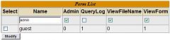 Ändern von gesetzten BerechtigungenÄndern der Berechtigungen einer bestimmten Berechtigungsgruppe wird durch Klick auf dem entsprechenden Namen unter der Permissions-List ("Perm List") eingeleitet. Der Name der Berechtigungsgruppe kann nun im Textfeld geändert werden. Diese Änderung hat keine Auswirkung auf bereits an Benutzer/Gruppen zugewiesene Berechtigungen - es ist lediglich ein Anzeigename, eine Bezeichnung. Die einzelne Funkionen können durch Selektieren bzw. Deselektieren der Checkboxes aktiviert oder deaktiviert werden. Mit Modify werden die Änderungen übernommen. Um die Bedeutung der Berechtigungs-Bezeichnungen nicht immer nachschlagen zu müssen, sollten Tool-Tips mittels Text-Mapping eingefügt werden. Mehr hier: PersmissionsToolTips