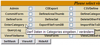 PersmissionsToolTipsTool-Tips mit der Bedeutung / Auswirkung von PermissionsUm das Arbeiten mit den Permissions zu erleichtern und nicht immer die Bedeutung / Auswirkung einer Berechtigung (korrekter: Die Standard DesignBase-Bezeichnungen) nachschlagen zu müssen, kann Folgendes durchgeführt werden: In Construction Danach bekommen alle Berechtigungs-Definitionen einen Tool-Tip mit einer kurzen Beschreibung der Bedeutung / Auswirkung. Der Tool-Tip wird sichtbar, wenn man mit der Maus kurz auf einem Begriff verweilt.